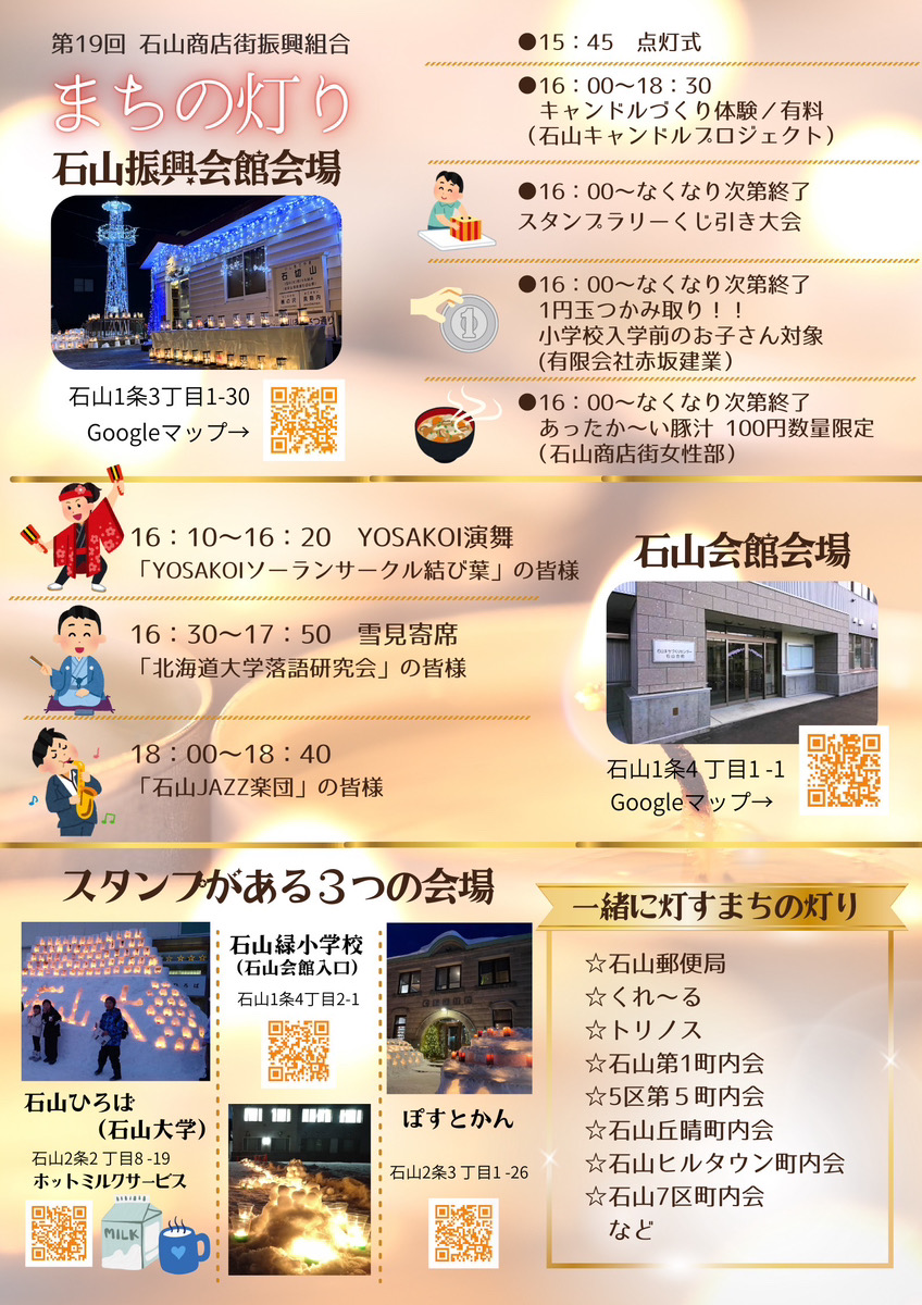 3つの会場(石山ひろば・石山緑小学校・ぽすとかん)を巡って、美しい灯りを楽しみながらスタンプを集めましょう! スタンプを3つ集めると、石山振興会館で「くじ引き」に挑戦できます。(景品がなくなり次第終了) ※石山ひろばではホットミルクのサービスもあります🥛✨