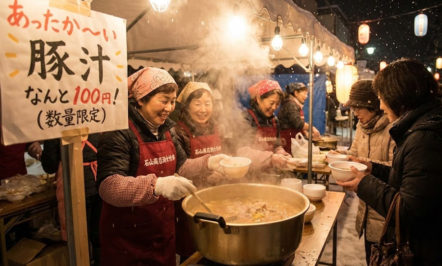 あったか~い豚汁:なんと100円!(数量限定・石山商店街女性部)