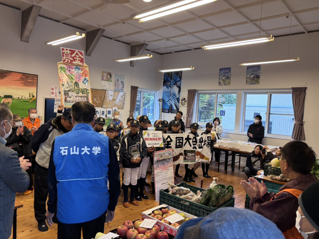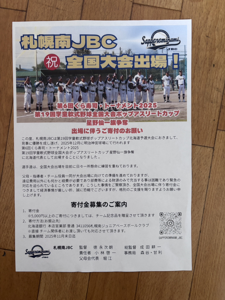2025-10-28 / 最終更新日 : 2025-10-28 石山商店街 振興組合 その他 「札幌南JBC」が明治神宮球場で行われる全国大会に出場決定! 南区から全国へ!おめでとう! 地域の少年野球チーム「札幌南JBC」が明治神宮球場で行われる全国大会に出場する事になりました。そこで、石山商店街振興組合からお祝い金として石山振興会館で山本理事長より徳永監督へ贈呈しました。子供達からは「頑張ってきます」と大きな声で決意を表してもらいました。 Follow me! FacebookXBlueskyCopy